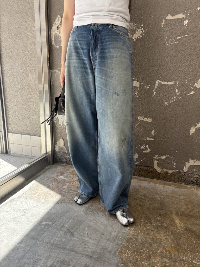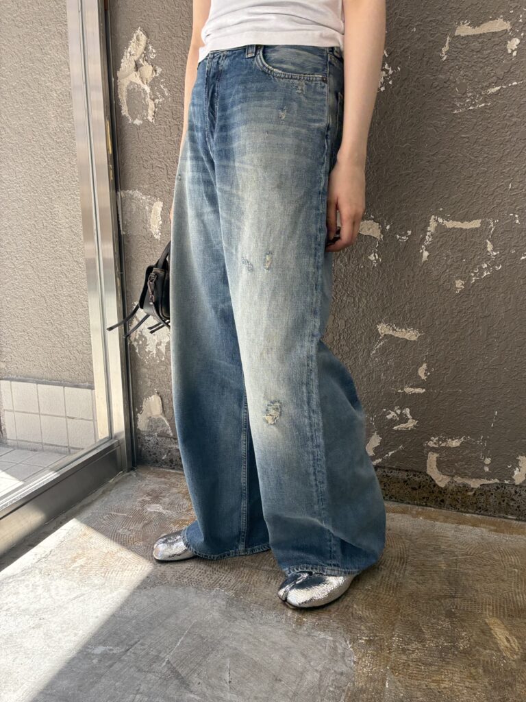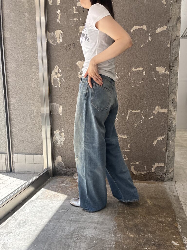 軽量デニムを使用したジーンズで、柔らかなペールウォッシュと織り目の表情が特徴です。