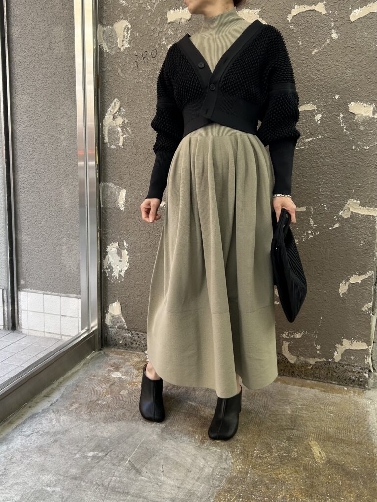 ノースリーブのワンピースはPOTTERY より柔らかい編地でエレガントなドレープが特徴的です。