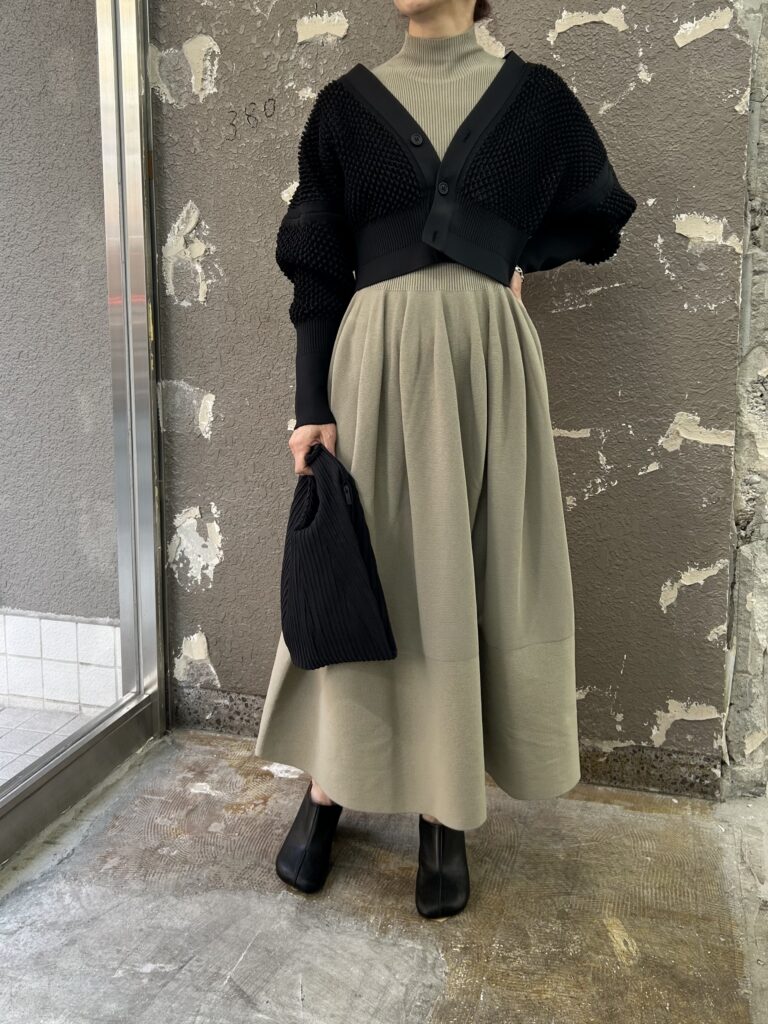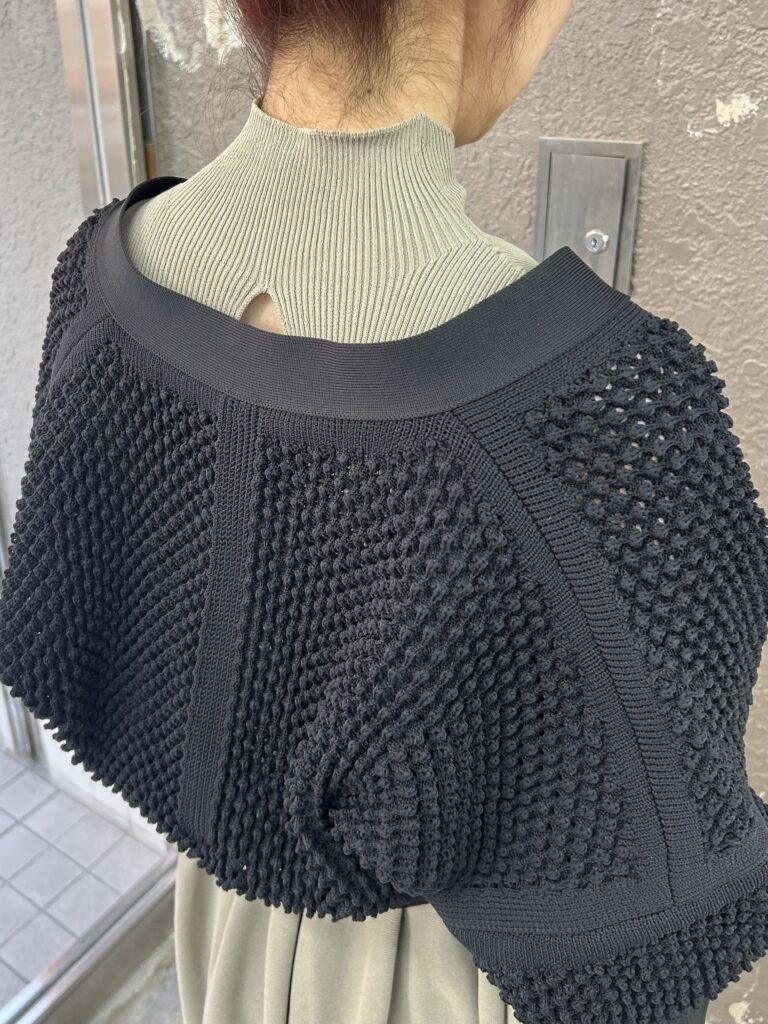 また合わせたカーディガンは定番的なシルエットですが、ポコポコとした格子編みで立体感があります。