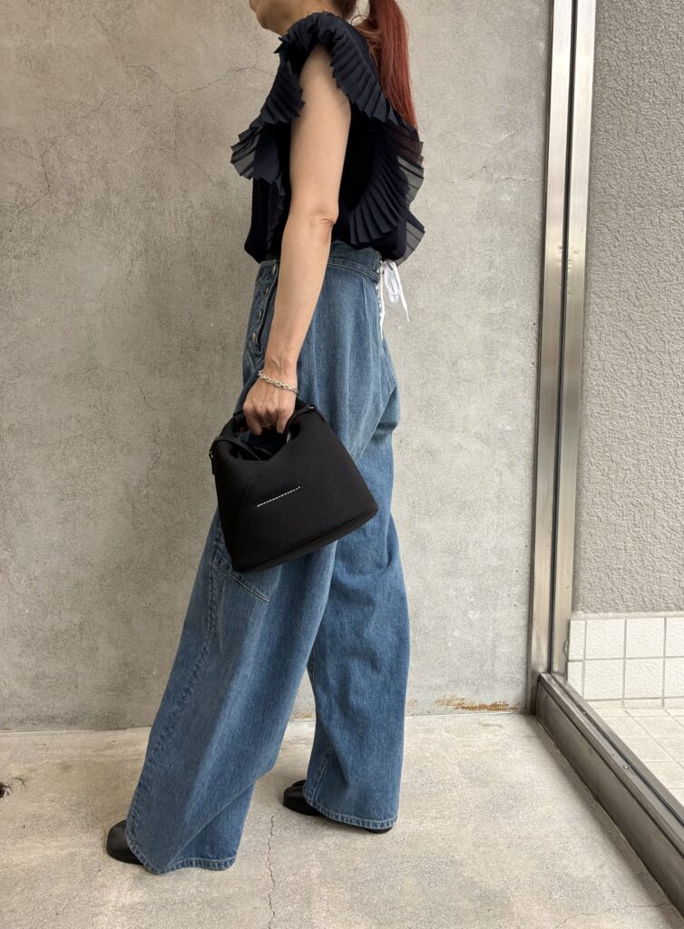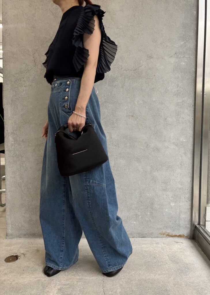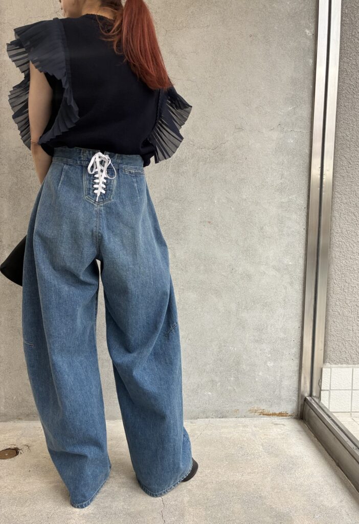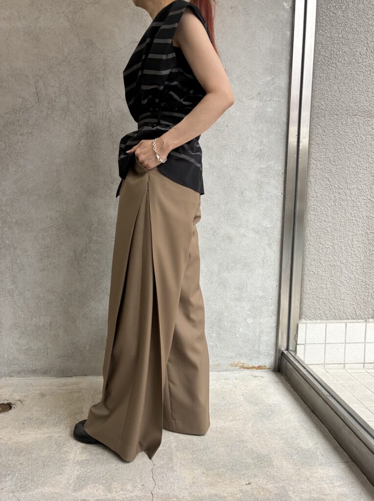 パンツはタックがサイドにあることによって、横から見るとボリューム感ありますが前から見るとボリュームを感じないバランスの取りやすいパンツになっています。