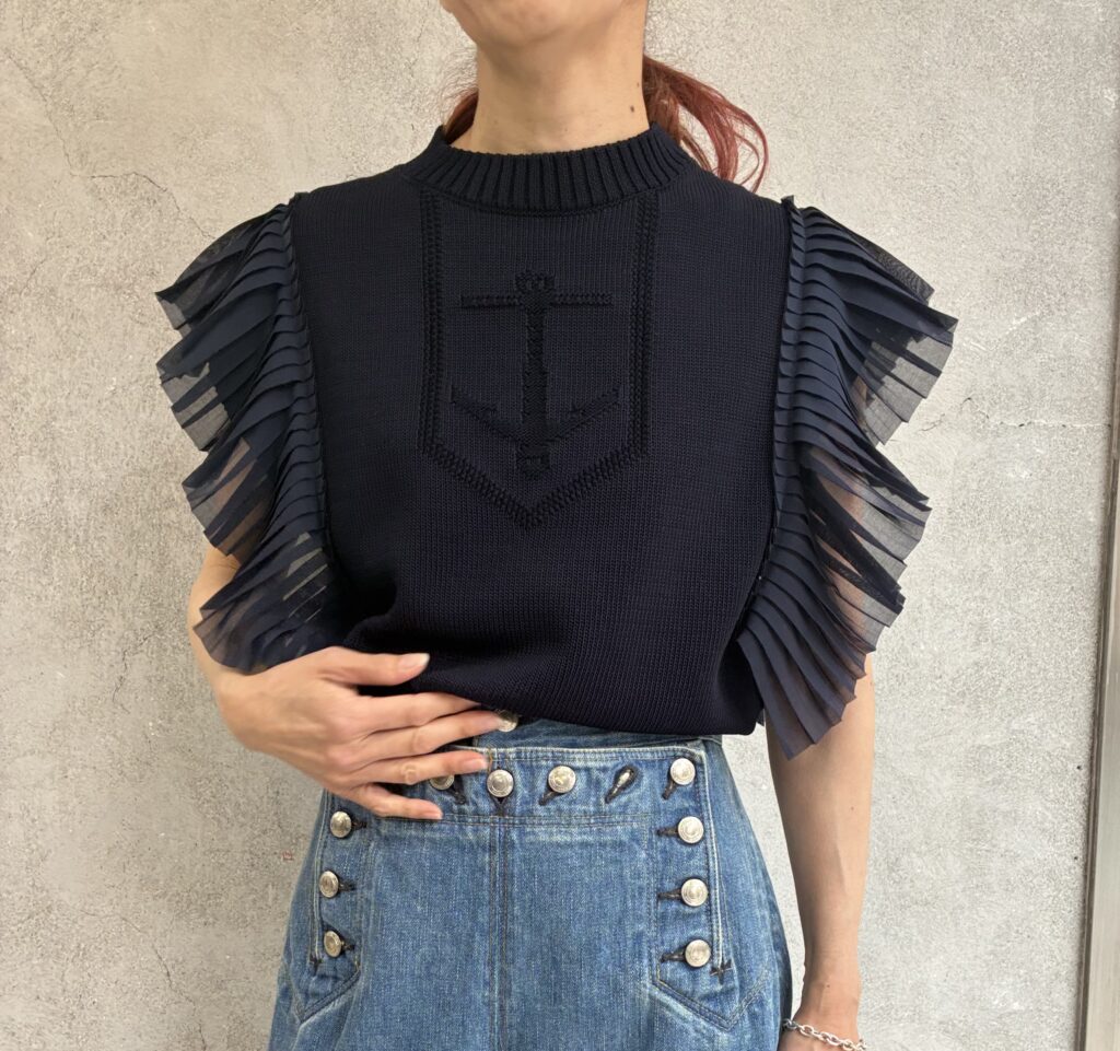 TOPS SLEEVELESS PLEATED GUERNSEY KNIT-NAVY- ¥35,200-