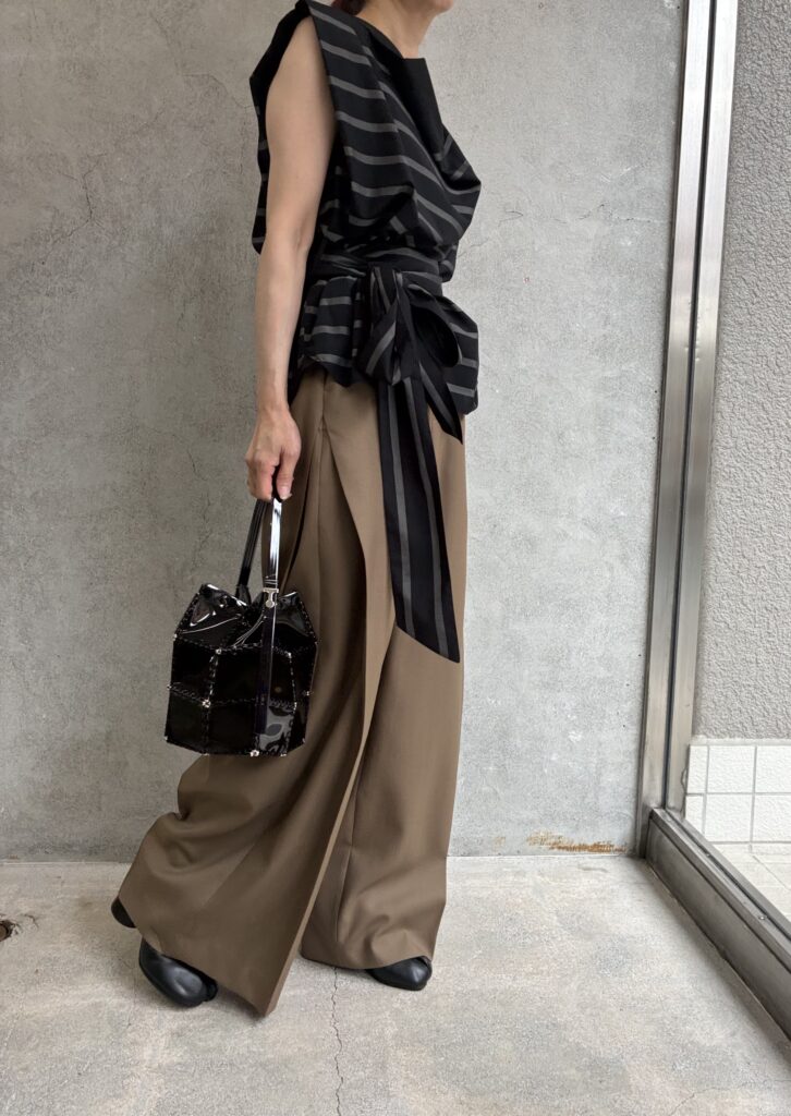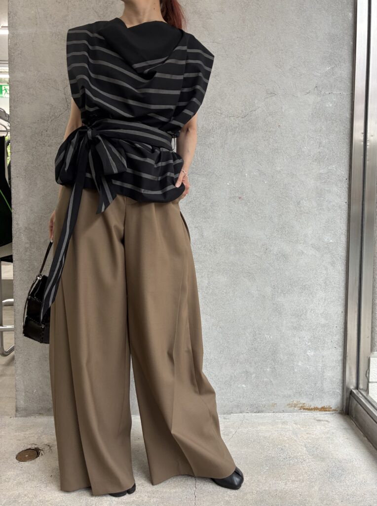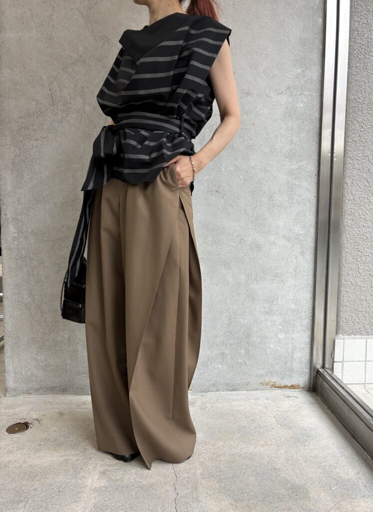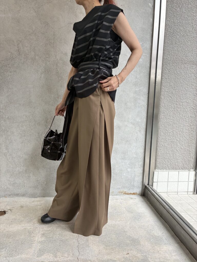 ドレープの効いたボーダーTOPSにサイドにタックを配したワイドパンツコーデ。