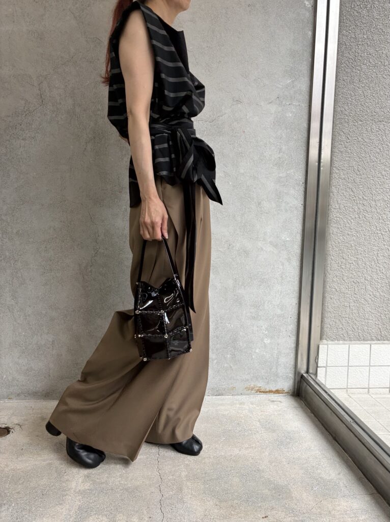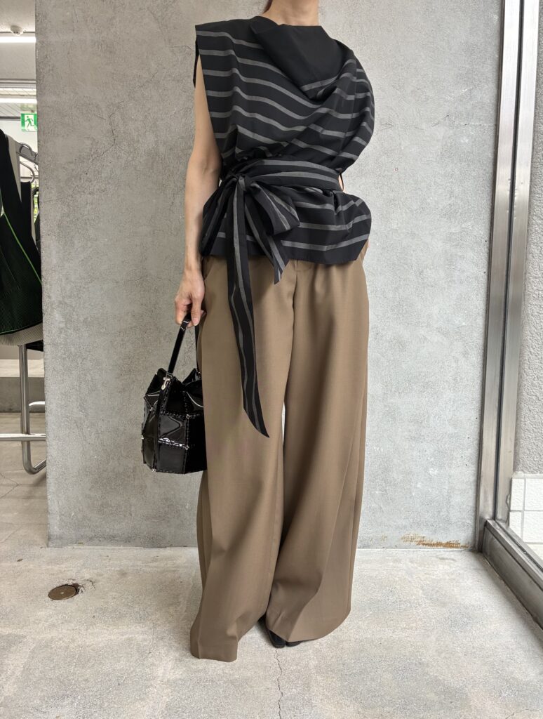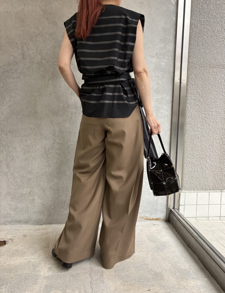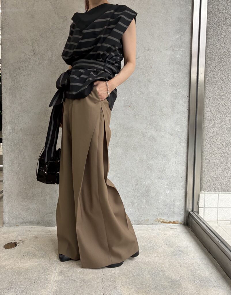 ドレープの効いたボーダーTOPSにサイドにタックを配したワイドパンツコーデ。