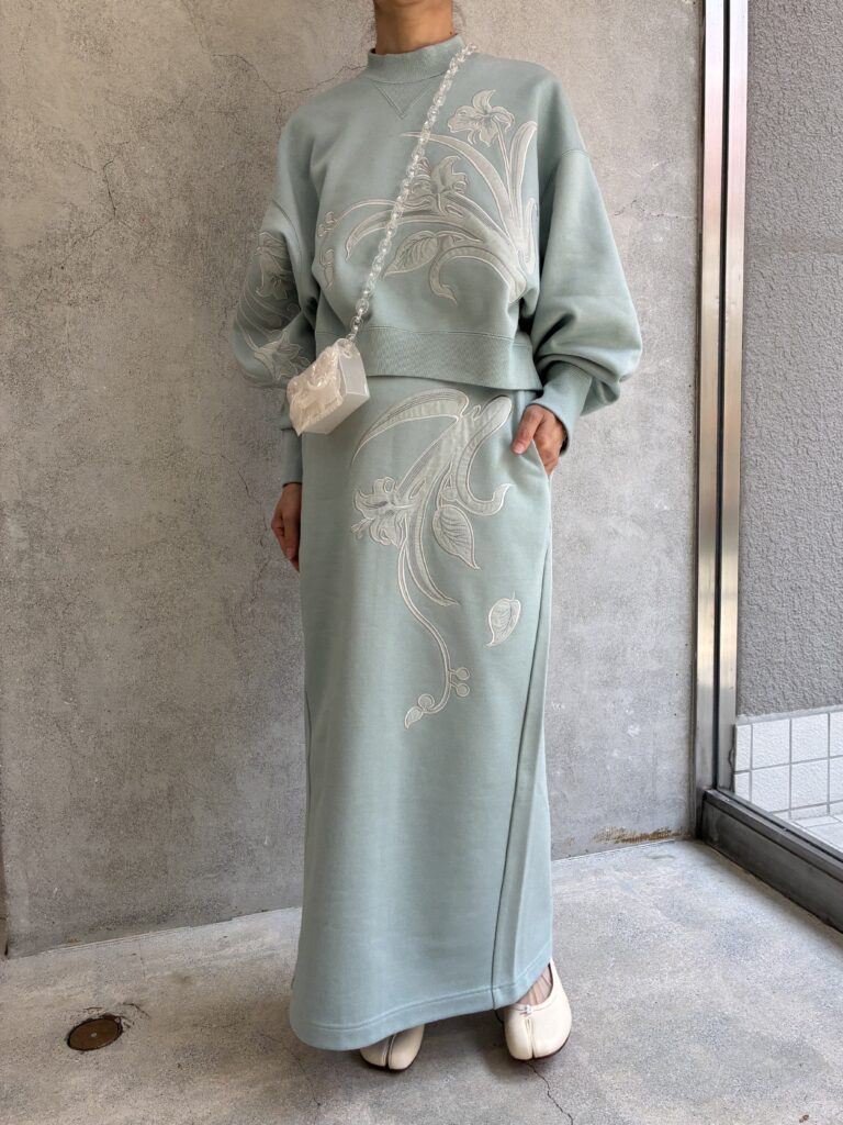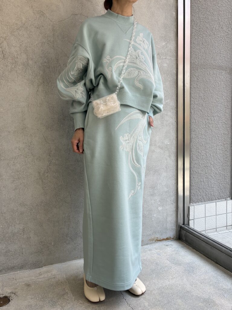 skirt/ Mame Kurogouchi: Floral Embroidery Sweat Skirt-LIGHT BLUE- ¥47,300-