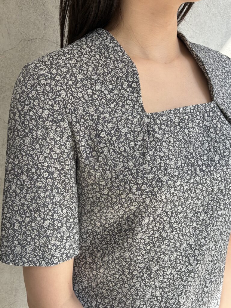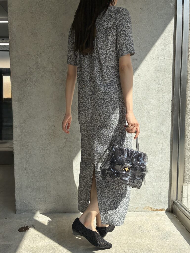 生地の表面に独特な凹凸のある小花柄ジャカード生地を使用したグレーのワンピースです。
