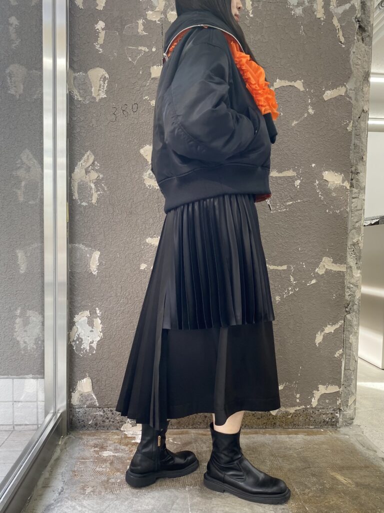 スカートも、今期のアイテムで、レイヤードされたプリーツスカートです。