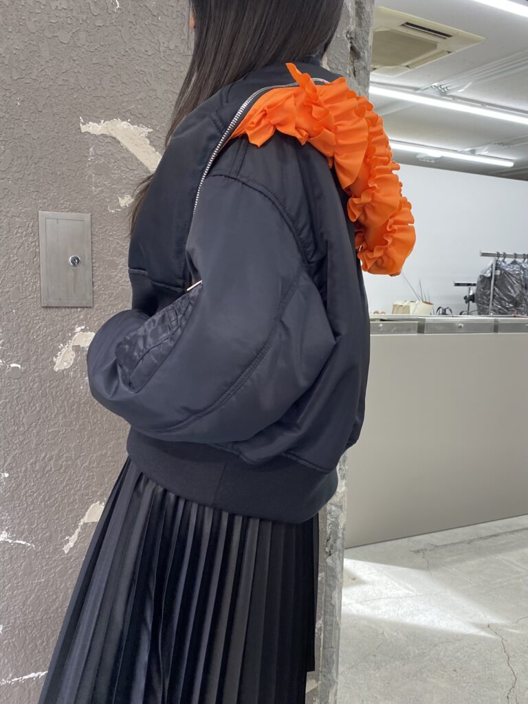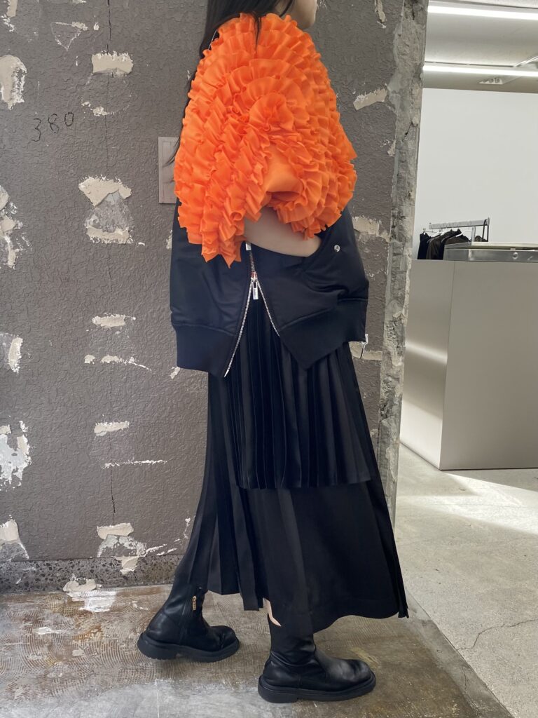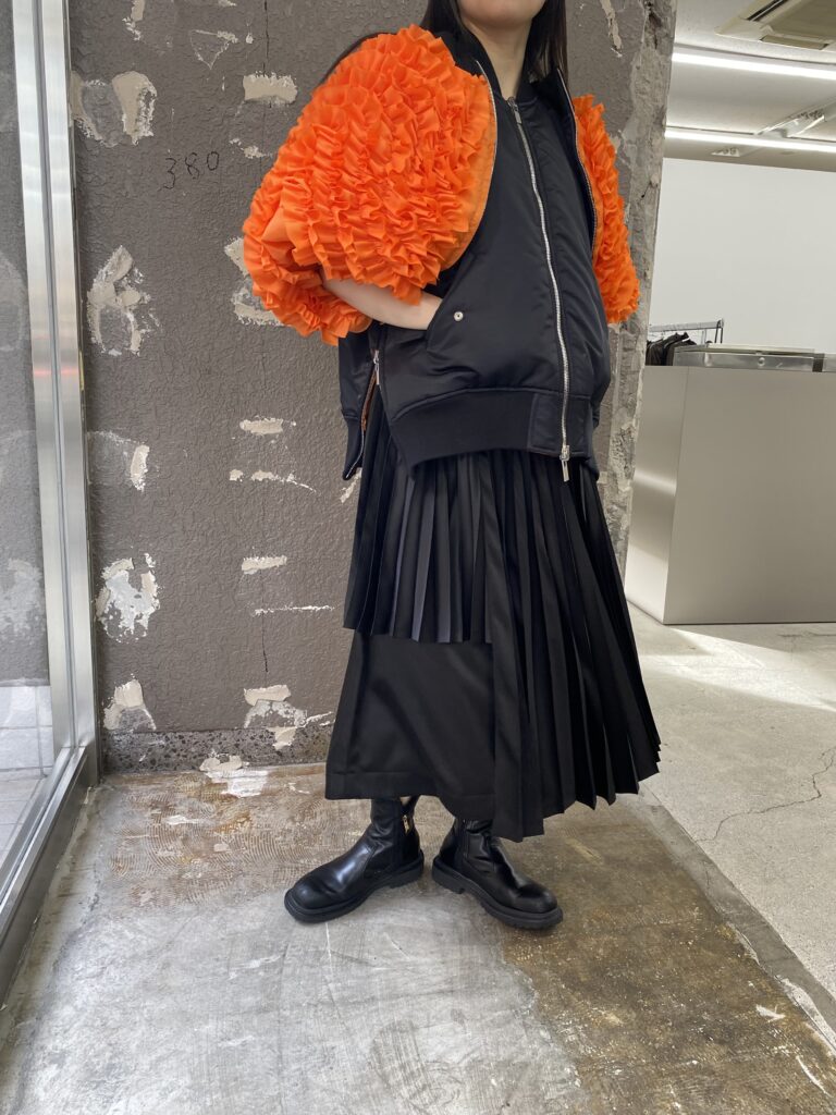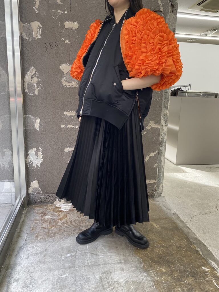 オレンジの面できると、フリルが袖部分に来るのでより重心が下へ感じるコーディネートになりそうです🎶