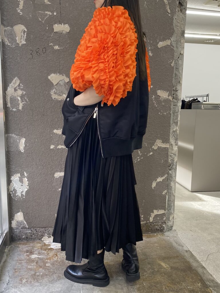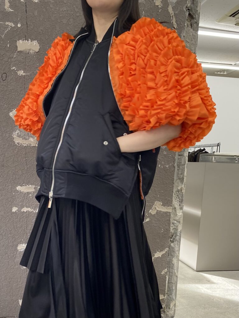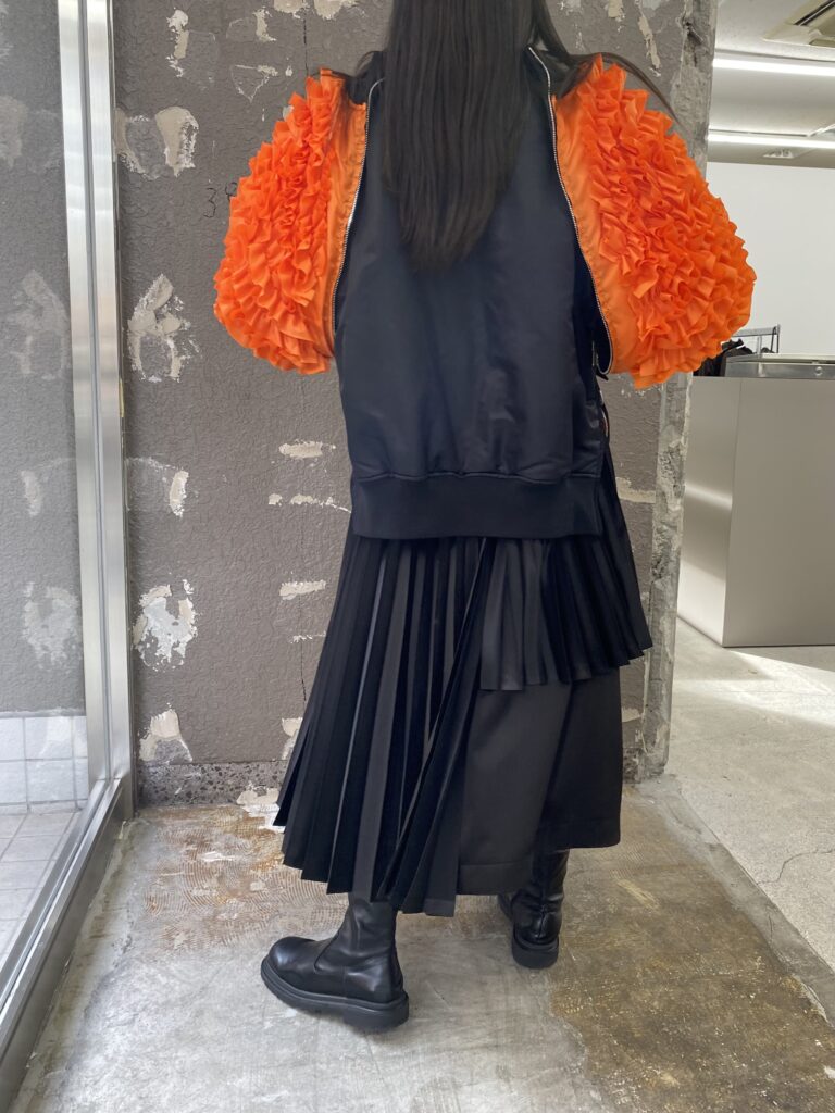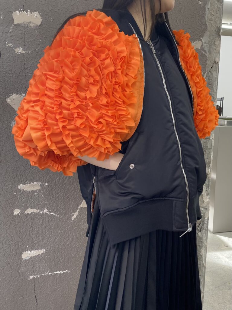 オレンジの面できると、フリルが袖部分に来るのでより重心が下へ感じるコーディネートになりそうです🎶