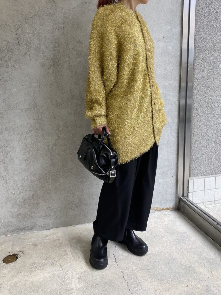 存在感ある毛足のあるラメ糸の入った糸でシンプルに編みたてているので、落ち感もあり春先まで活躍します。