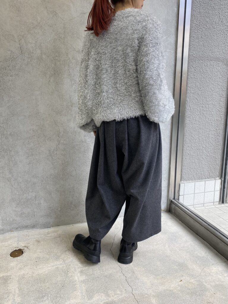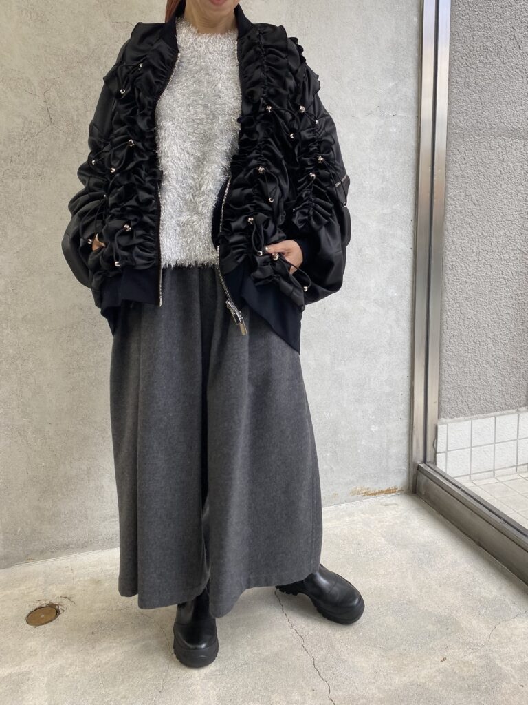 お尻が隠れる丈で安心感あるシルエットで今回はワイドレッグパンツに合わせましたが、スカート、細身のパンツやデニムとも合わせていただけます。