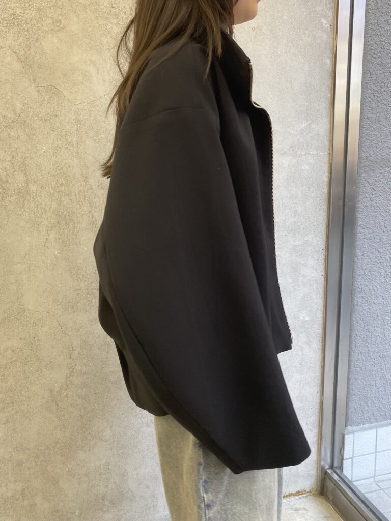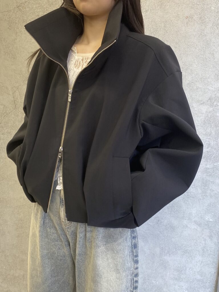 立ち上がる幅広のスタンドネックと、丸みを帯びた袖が特徴的なショートジャケットです。