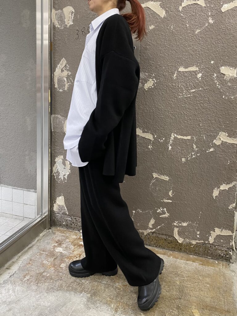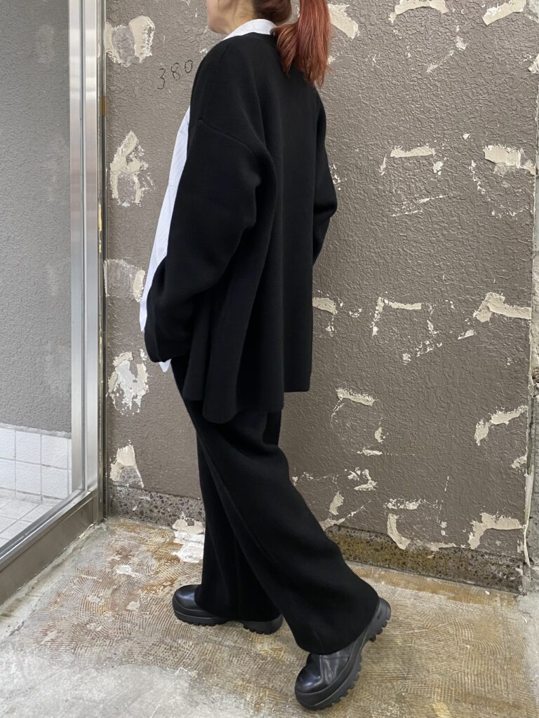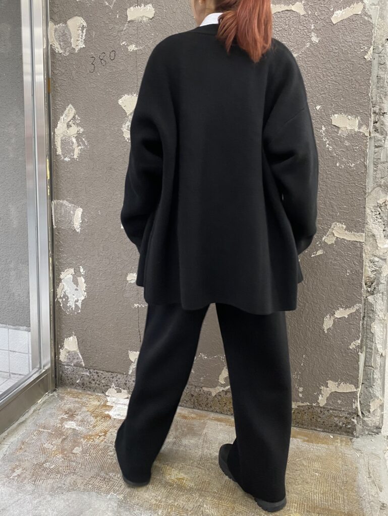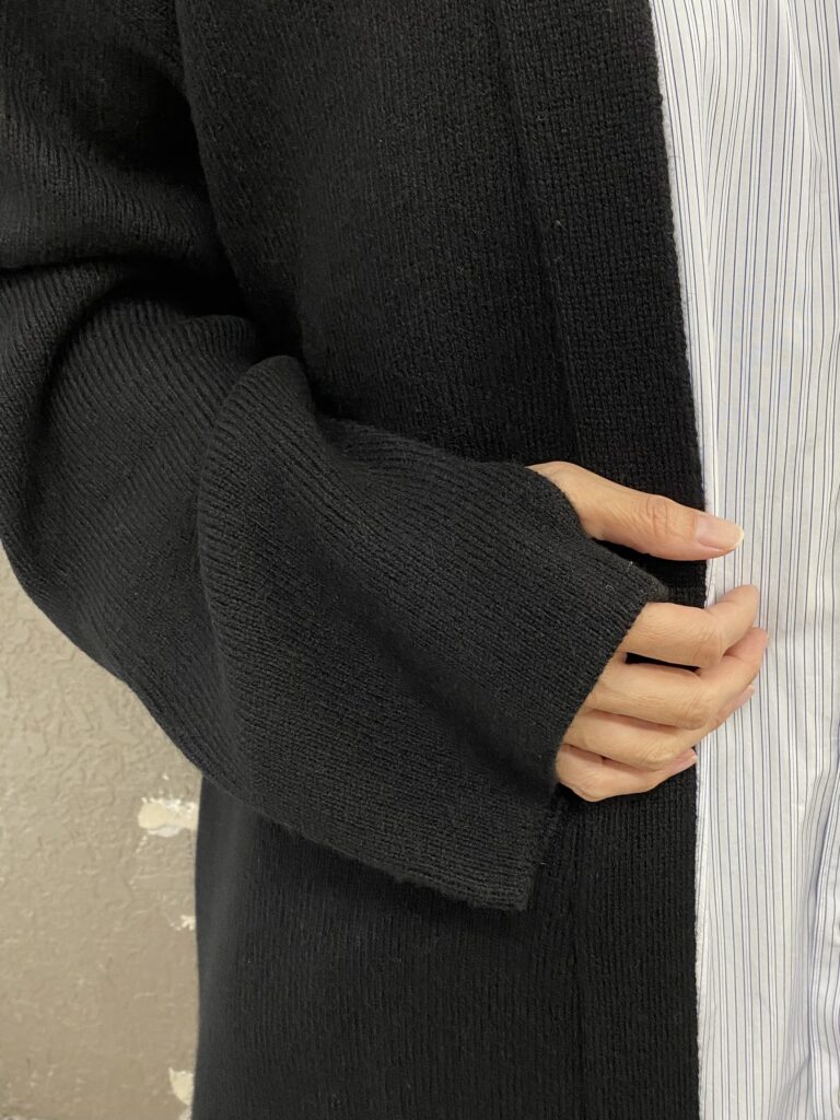 カーディガンはオーバーサイズでお尻が隠れる着丈で、前にボタンがないガウンタイプですのでコート未満で気軽に羽織っていただけます。もちろんアームにゆとりがあるアウターも上に羽織れますので、寒い冬も活躍するのは間違いないです。
