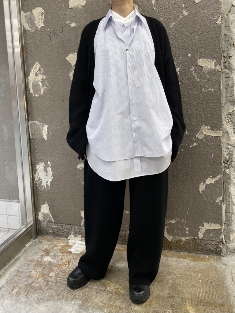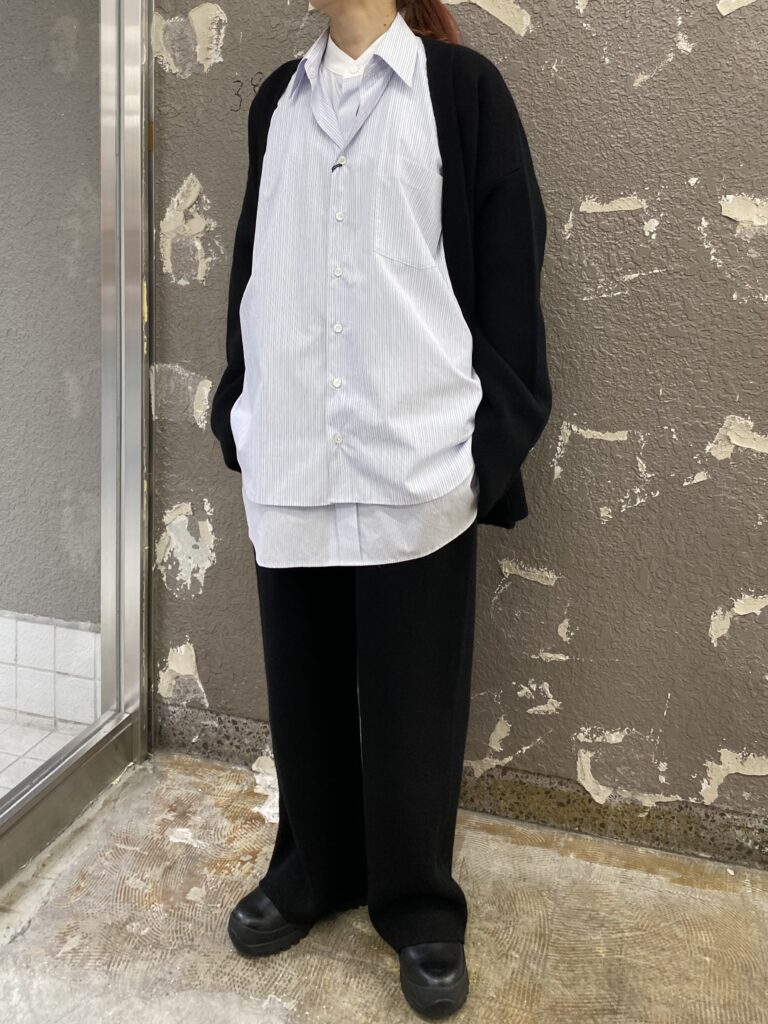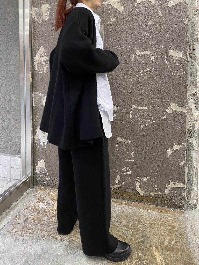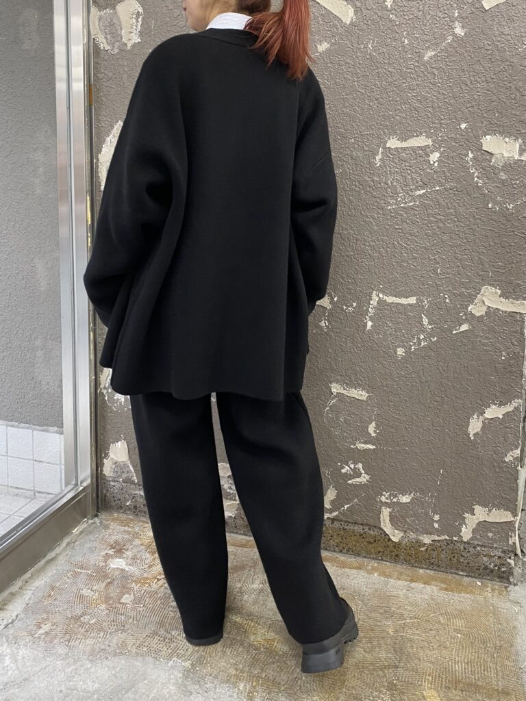 カーディガンはオーバーサイズでお尻が隠れる着丈で、前にボタンがないガウンタイプですのでコート未満で気軽に羽織っていただけます。もちろんアームにゆとりがあるアウターも上に羽織れますので、寒い冬も活躍するのは間違いないです。