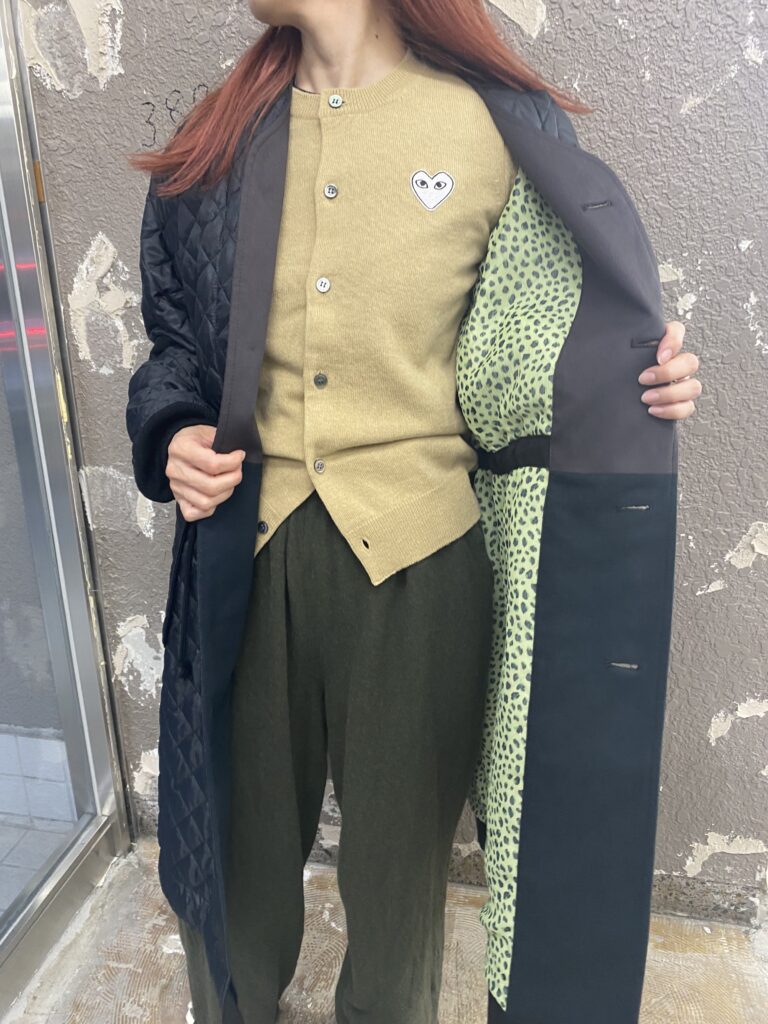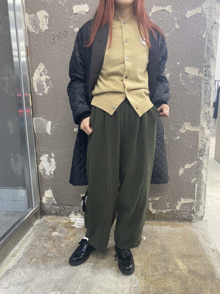 そして、カーキのパンツでしたのでベージュのPLAYのカーディガンで秋カラーのコーディネート。