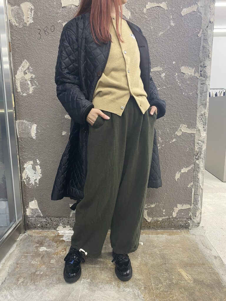 カーキのパンツは暖かみのある縮絨素材で落ち感があり、ウエストがイージータイプでラクに穿いていただけます。