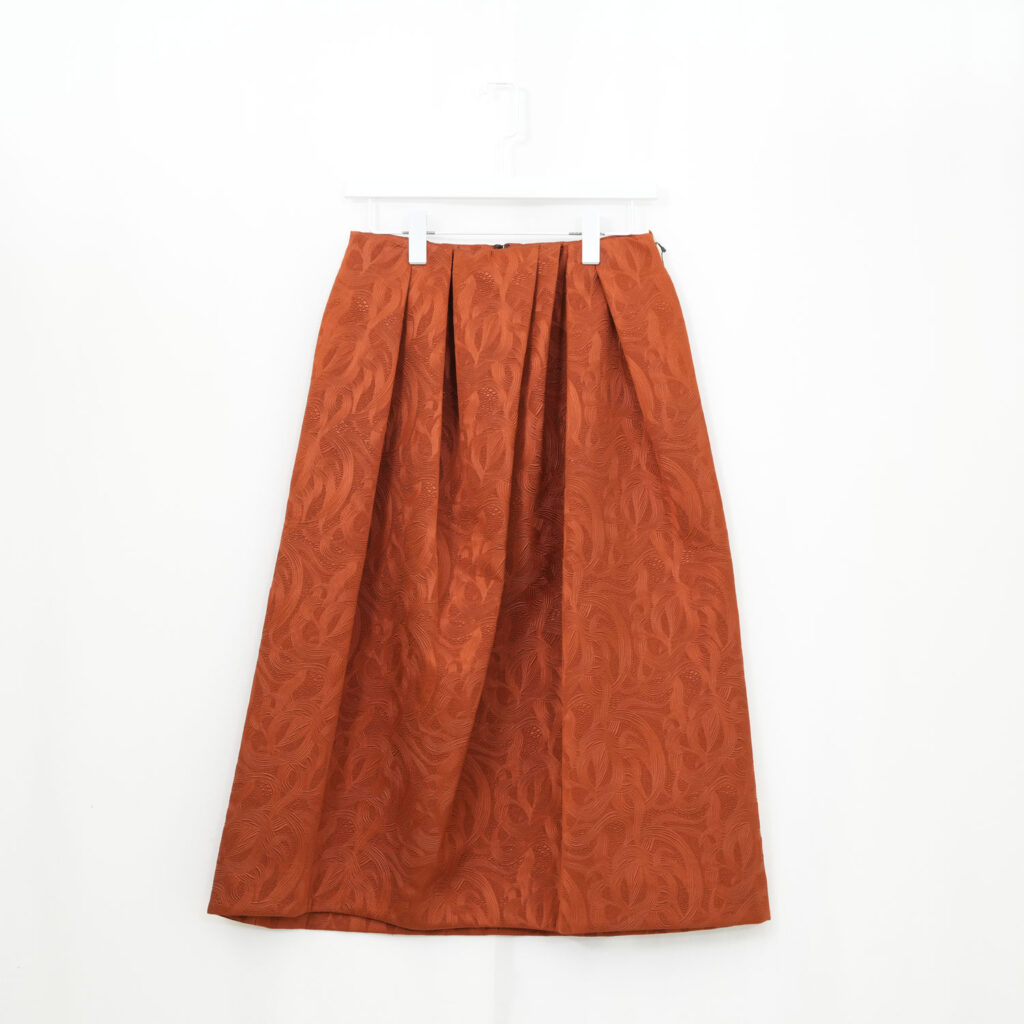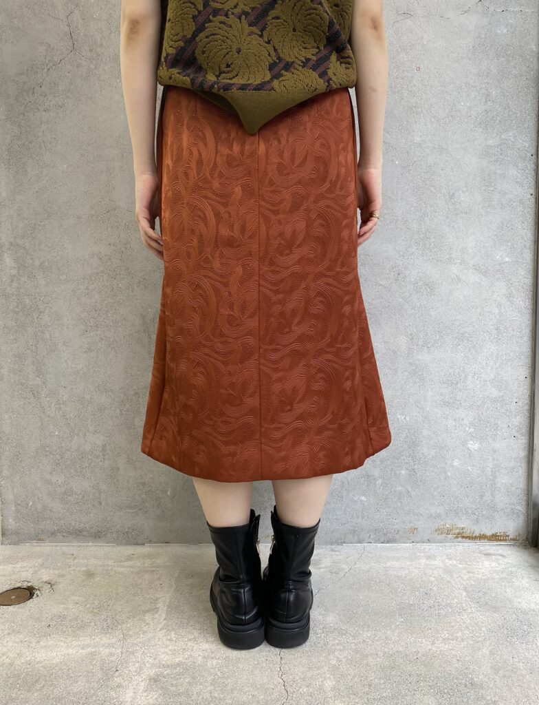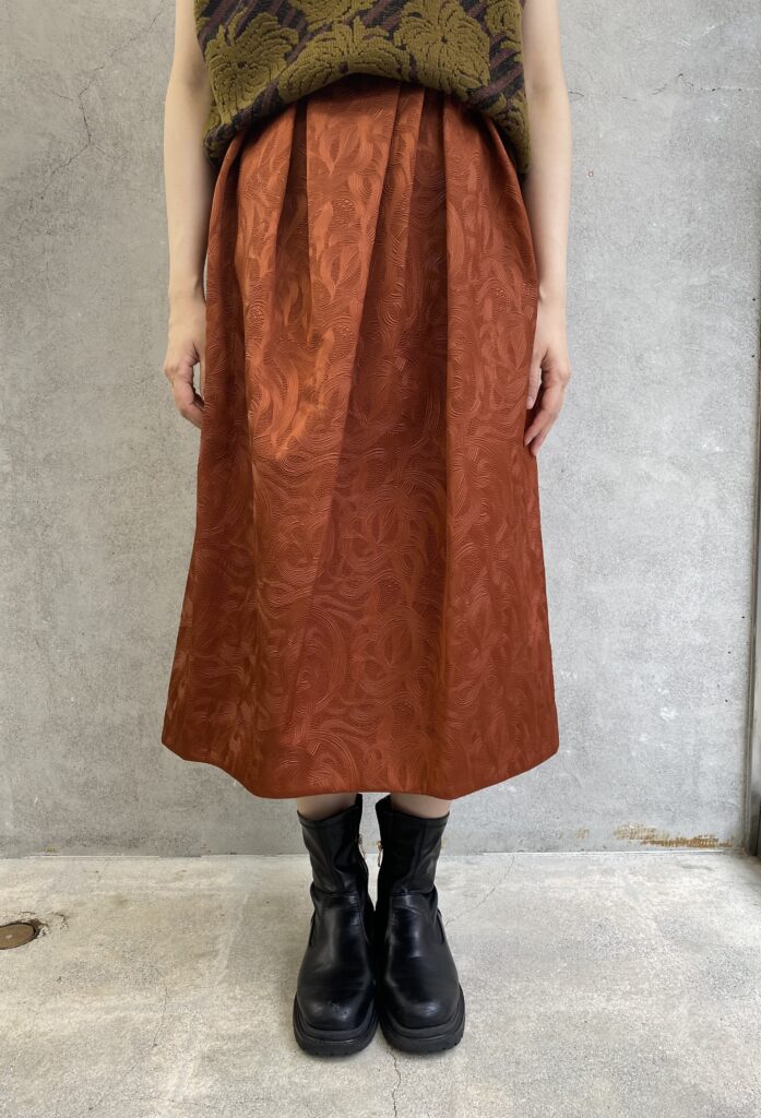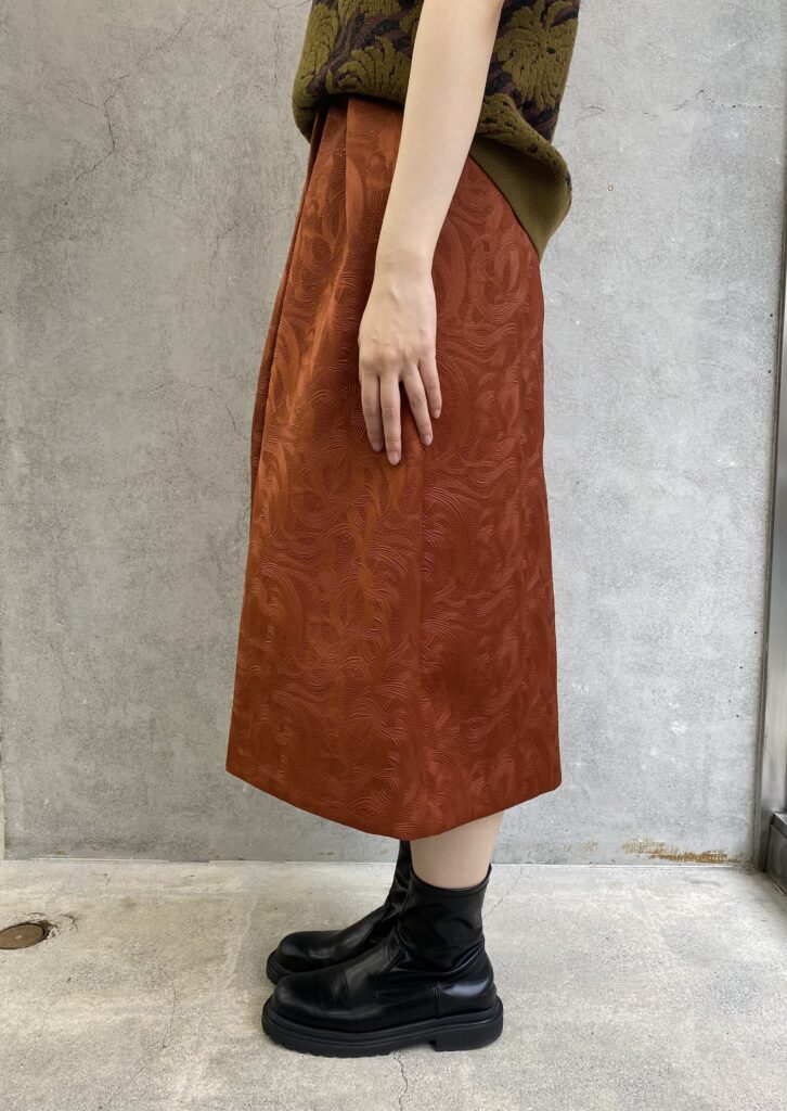 アラベスク柄をエンボス加工した生地のスカート。