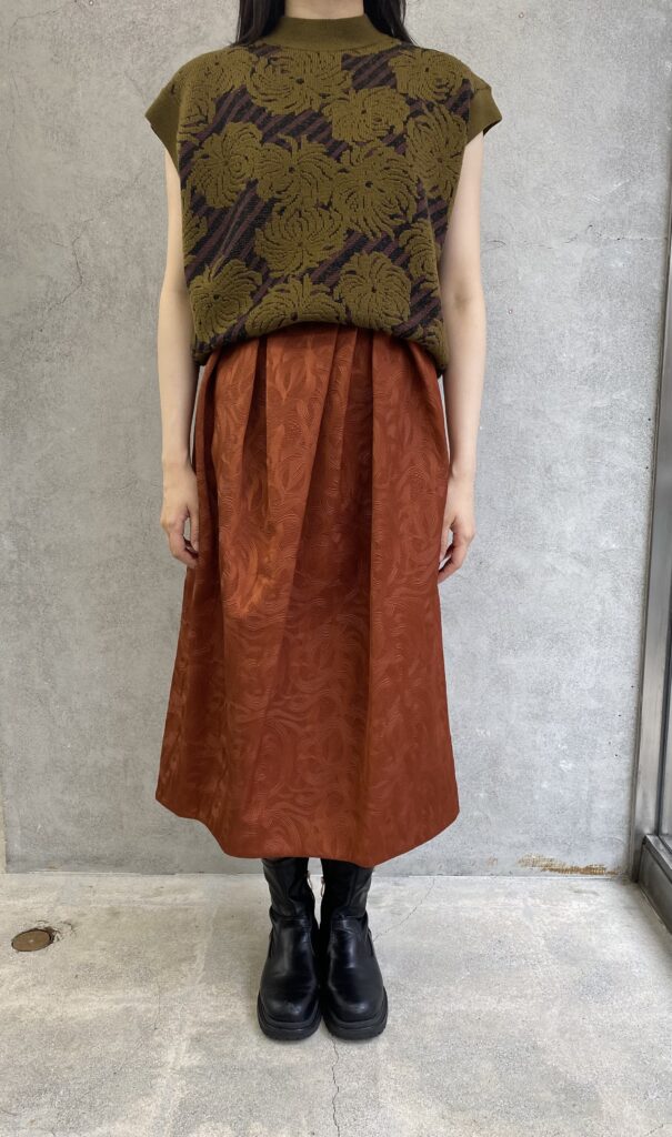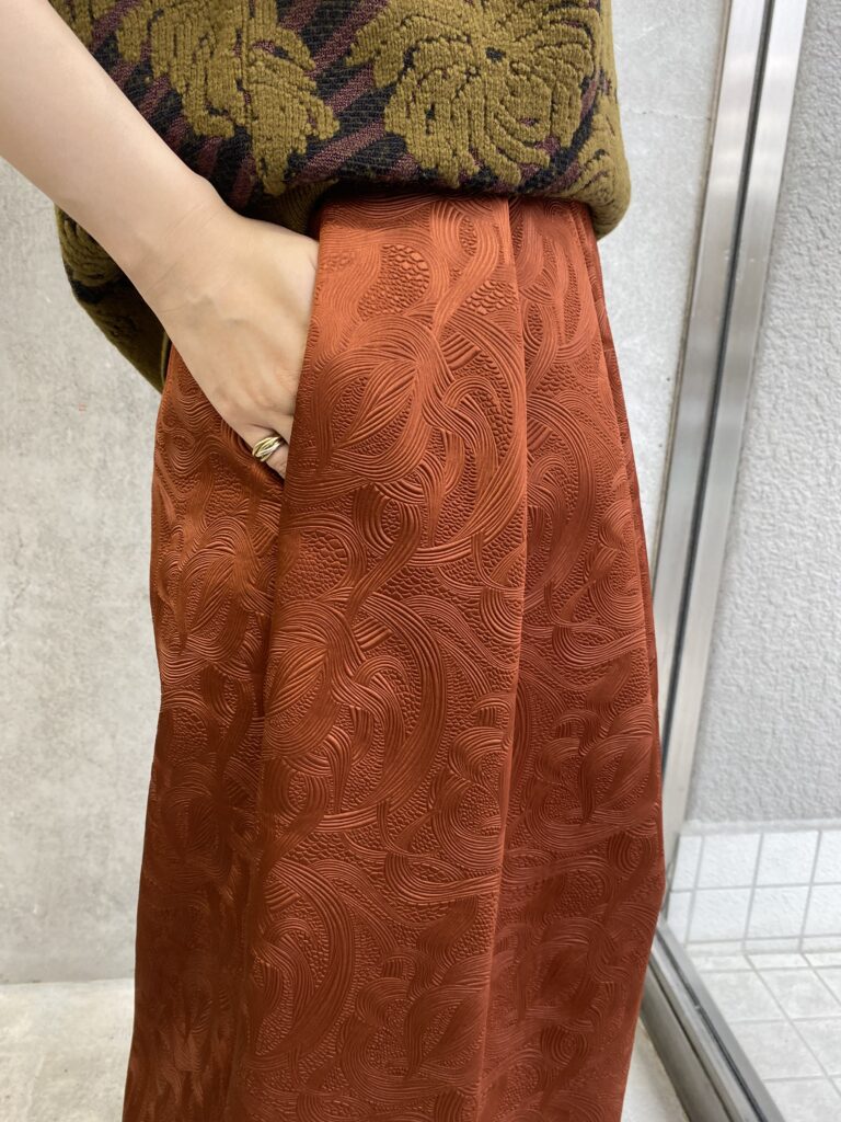 光の加減で柄が浮き立つ素敵な生地のスカートです。