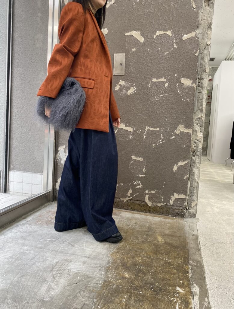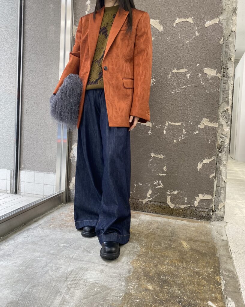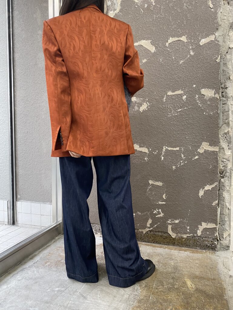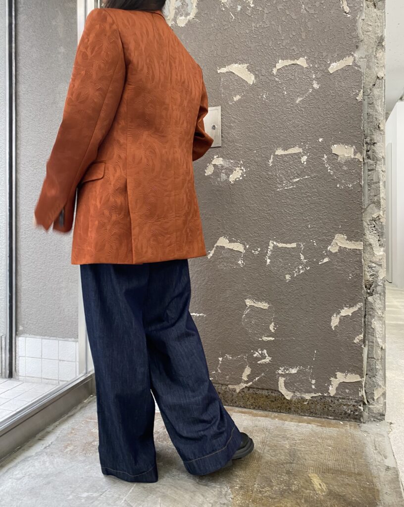 アラベスク柄のエンボス加工された生地のスッキリとしたジャケットコーデ。
