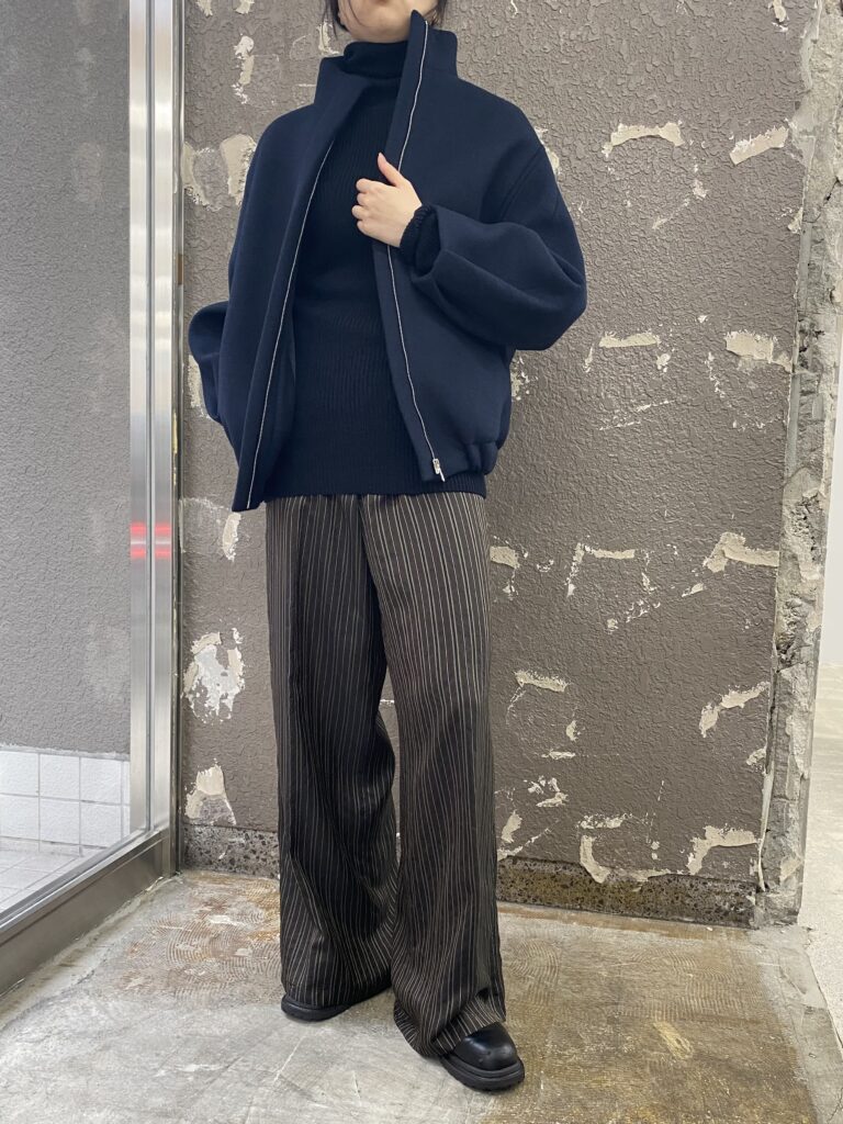 中に着ているニットは、身体に沿うシルエットではありますがローゲージニットです。