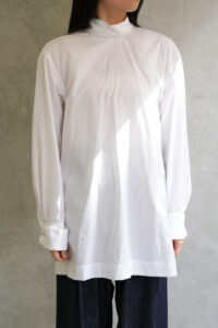 バルーンシルエットのチュニックのような着丈が長めシャツ。