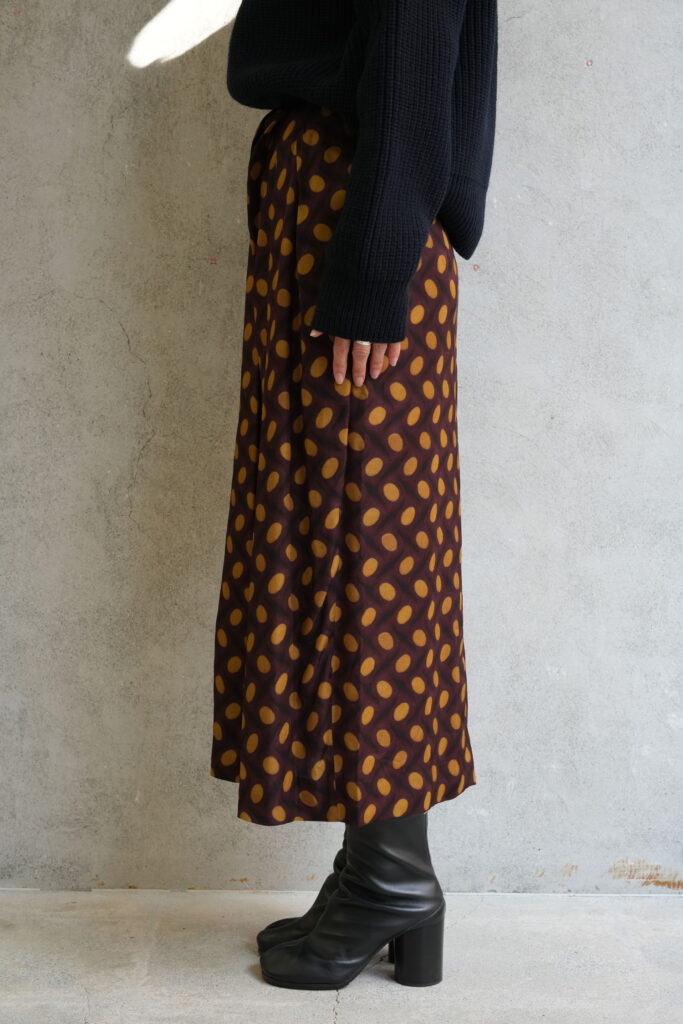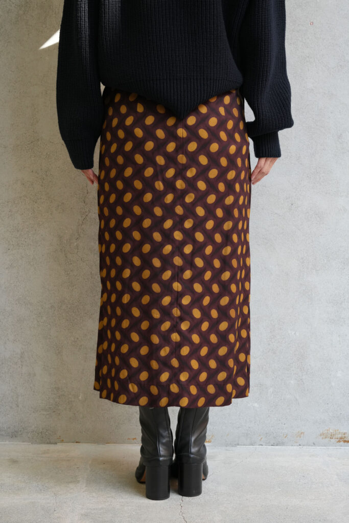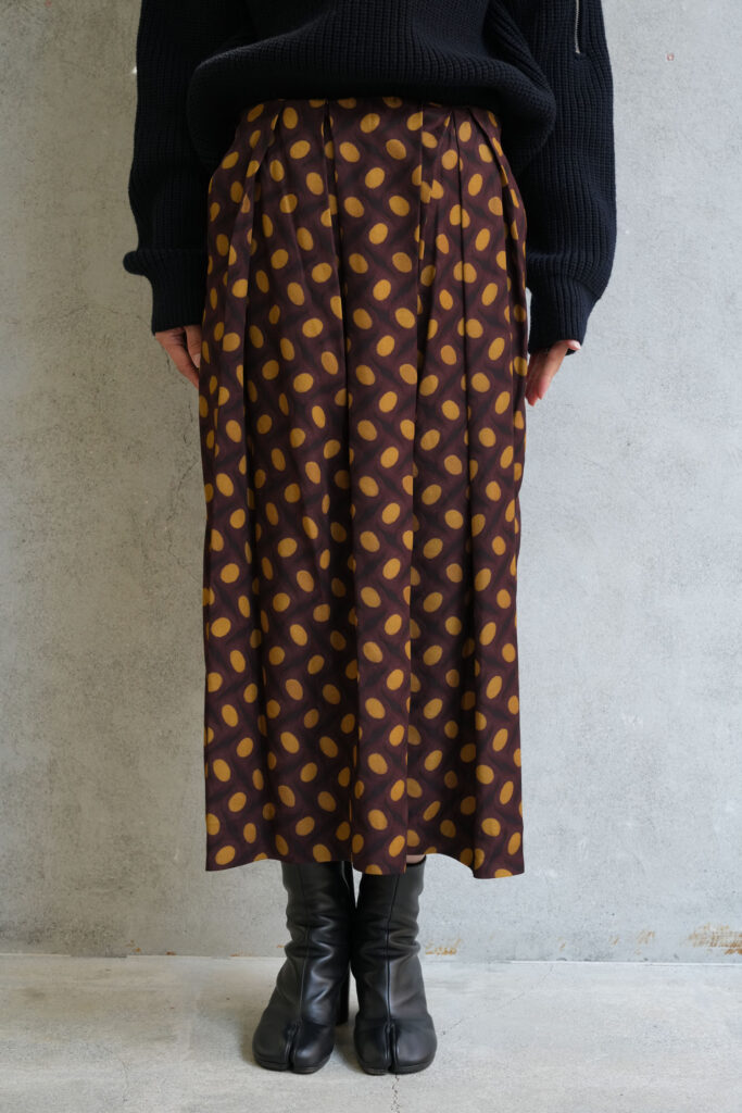 前はタックが配されて後ろはスッキリとしたシルエットのスカート。