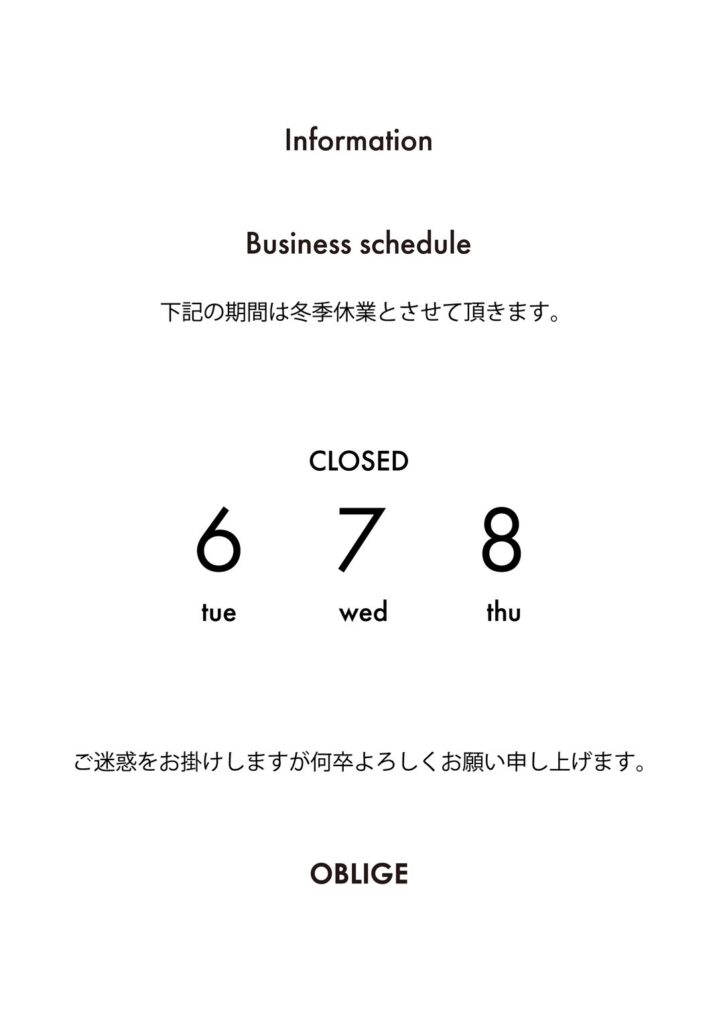 日頃よりOBLIGEをご愛顧いただきまして誠にありがとうございます。